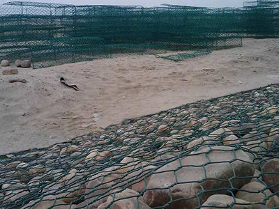 綠濱墊具有固堤防沖刷的作用, 固濱籠工藝是指將特種鋼絲由專用機(jī)械編織成雙絞、蜂巢形網(wǎng)目的格網(wǎng)片,根據(jù)工程設(shè)計(jì)要求,裁剪、設(shè)計(jì)、組裝成箱籠并裝入塊石等填充料后連接成一體的結(jié)構(gòu),用作提防、路基防護(hù)工程。